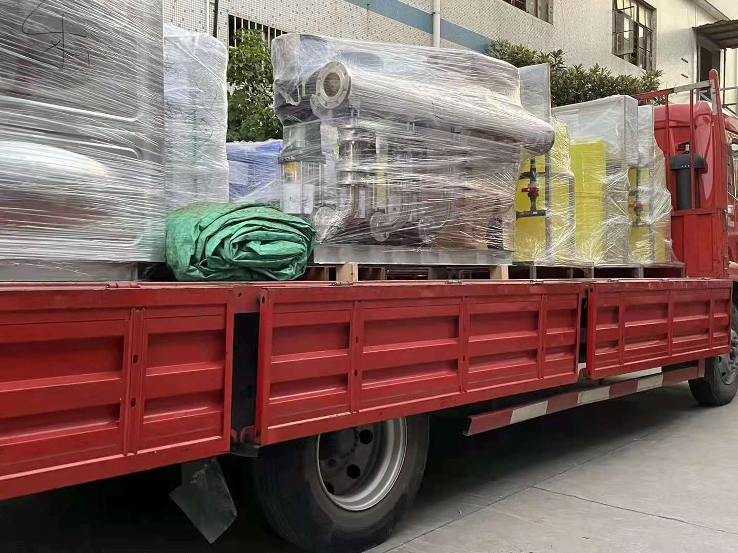 湖州德清項目:一批智能加藥裝置及變頻供水設備及智能砂濾裝置和不繡鋼加熱水箱裝車發貨完成,上海奧棟承諾必達!