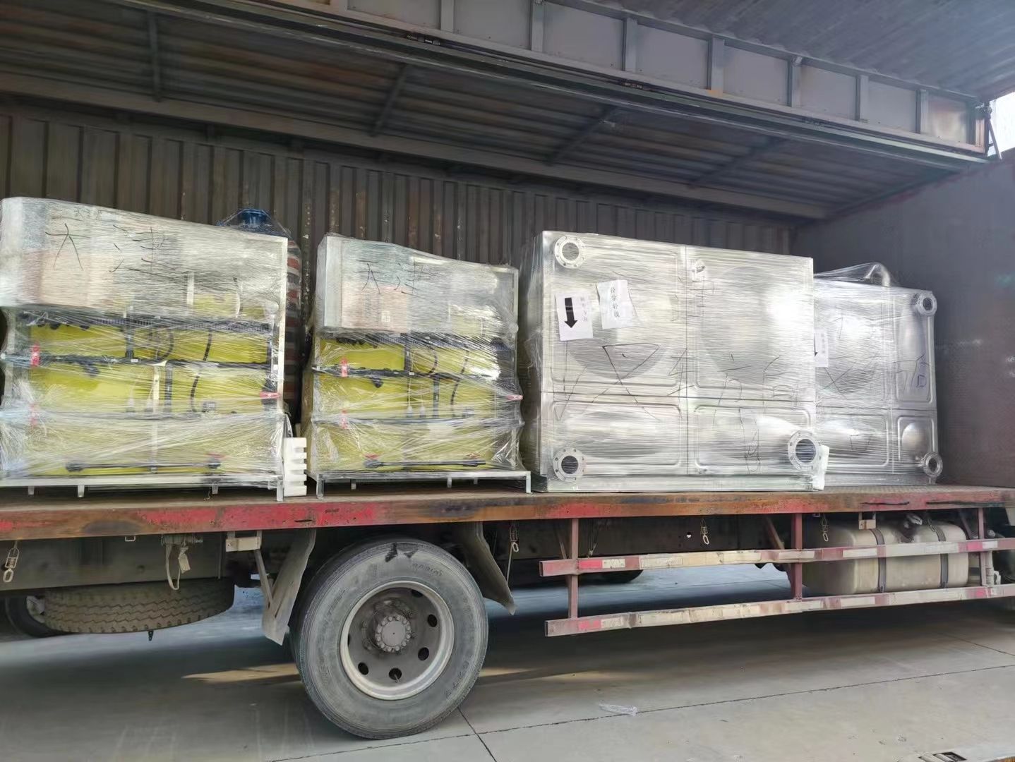 天津項目、棗莊項目、寧波項目:一批不銹鋼水箱和板換及變頻供水設備裝車發貨完成,上海奧棟承諾必達!
